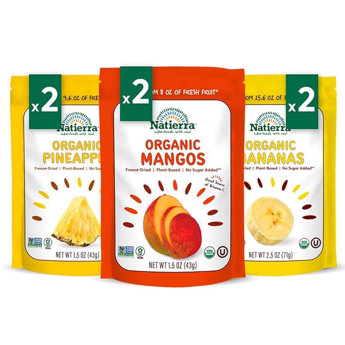 NATIERRA Organic Freeze-Dried Pineapples, Bananas & Mangos | USDA Organic, Non-GMO & Vegan, Gluten Free, No Additives, No Sugar Added | Variety Pack (Pack of 6)