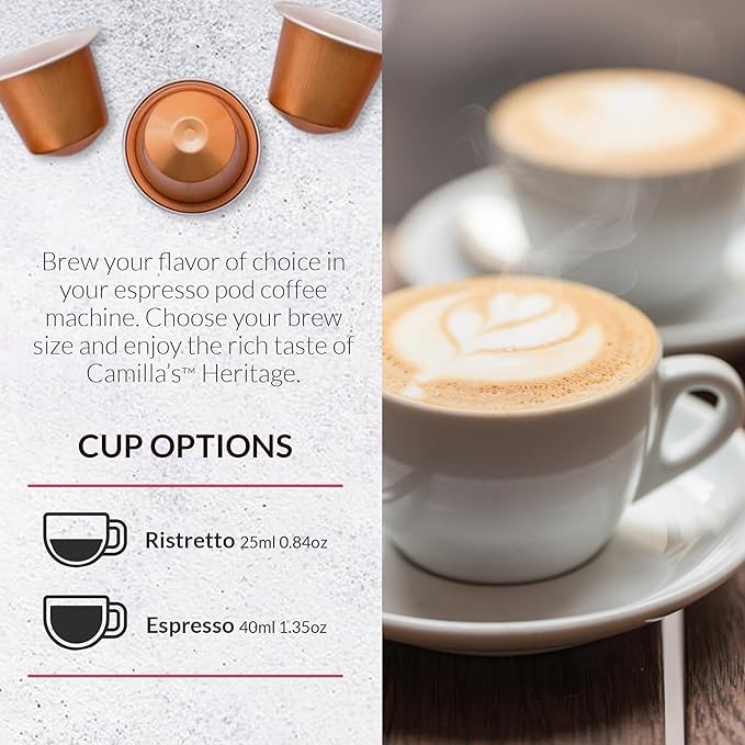 - Perfect Cup, Every Time: Each coffee capsule brews 0.85 oz/25 ml or 1.35 oz/40 ml. Just pop the pod of coffee in your original espresso pod machine, choose your brew size, and enjoy the rich taste of Camilla’s Heritage.