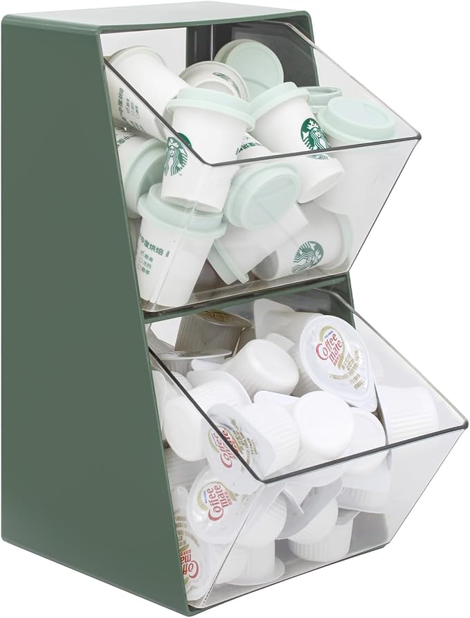 - Compact Size, Big Impact --- Our coffee pod holder with two removable bins for k cups, tea bags, sugar, creamer etc. This storage box offers the flexibility to be customized and adjusted according to your needs. Whether used individually or stacked, it provides ample storage space to accommodate your high-capacity storage requirements. Idea for small coffee bar accessories in the coffee station, counter, drawer and cabinet use.Everything is easy to find in the clear drawers.