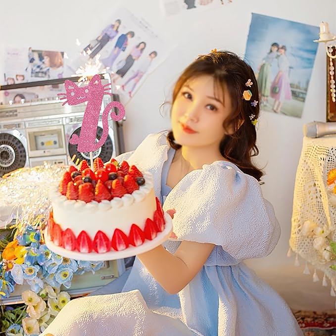 1 Pack 7th Cake Topper Glitter Cat Birthday Cake Pick Cute Pet Cat Cake Decoration for Cat Theme Baby Shower Kids Seven Birthday Wedding Party Cake Decorations Supplies Pink
