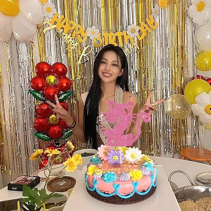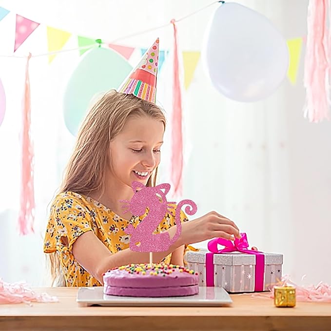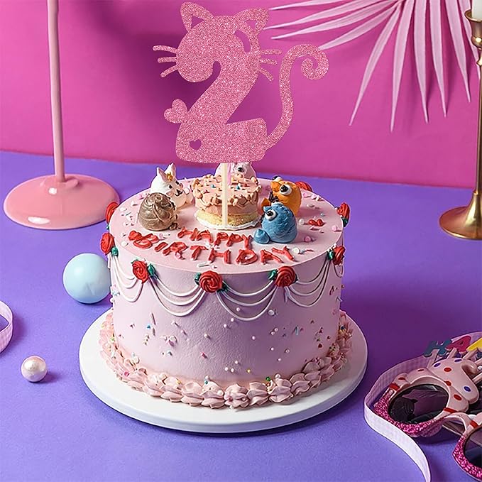 1 Pack Cat Cake Topper 2nd Birthday Cake Pick Glitter Cute Pet Cat Cake Decoration for Cat Theme Baby Shower Kids Second Birthday Wedding Party Cake Decorations Supplies Pink