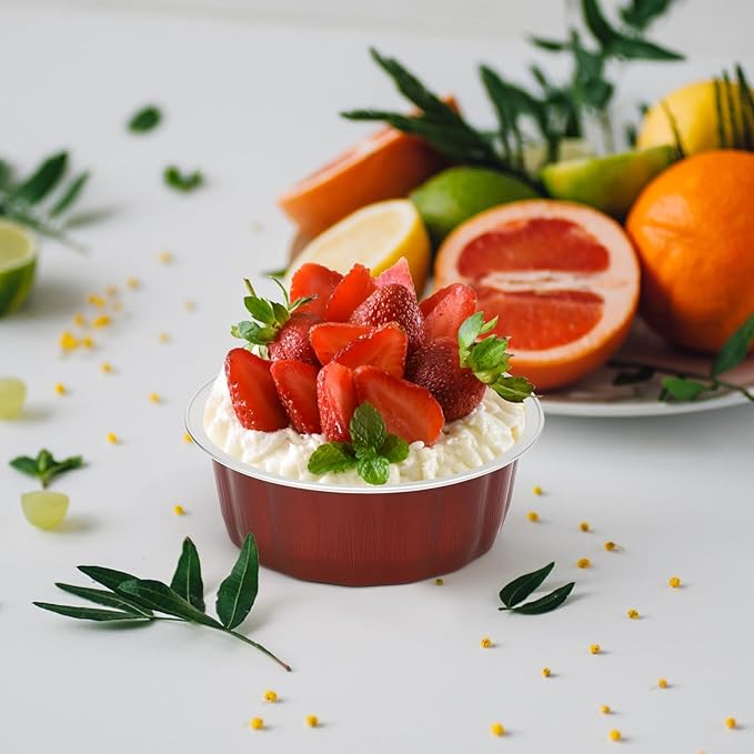 Beasea Disposable Ramekins for Baking, 8oz 50 Pack Aluminum Foil Cups with Lids, Creme Brulee Muffin Cupcake Baking Cup Mini Pudding Cups for Party Wedding Birthday - Wine Red