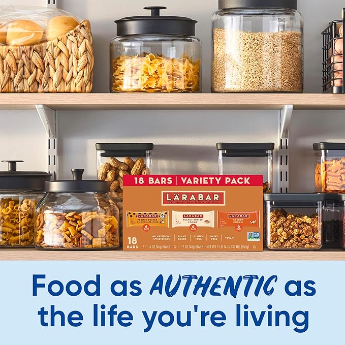 - CONTAINS: One Larabar variety pack of eighteen bars; 6 Peanut Butter Chocolate Chip, 6 Peanut Butter Cookie, and 6 Cashew Cookie; 1 lb 14 oz total weight
