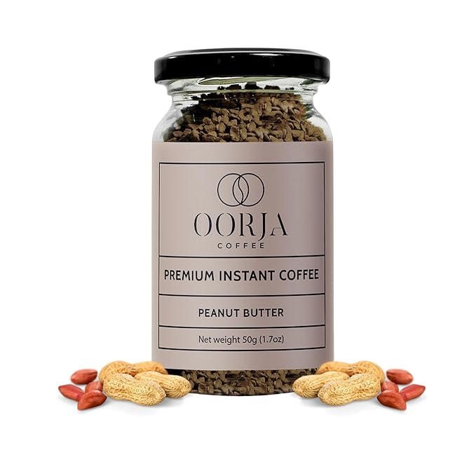 OORJA Instant Coffee Granules - Peanut Butter Flavored Freeze Dried Coffee Made From Medium Roast 100% Arabica Beans for Quick Hot and Iced Coffees, 25 Servings