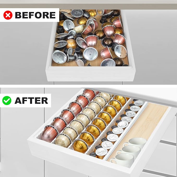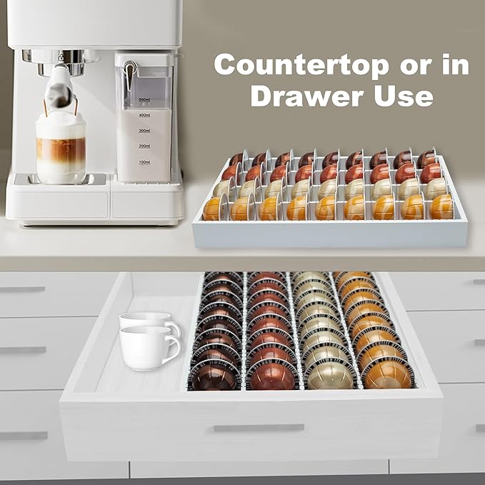 - Simple and Stylish:Looks stylish enough to be displayed on a countertop and fits in many standard drawers, providing enough space to store and organize up to 14 oz capsules. This drawer organizer is perfect for home, office, kitchen, conference room, coffee station. It is a coffee station accessories that is very suitable for most decoration styles.