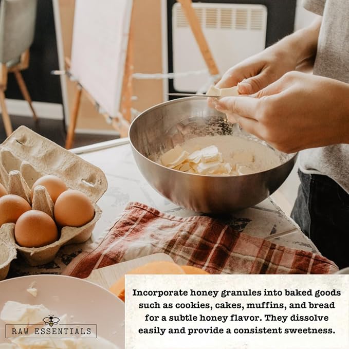 - Ideal for Baking and Cooking: Honey Granules are a baker's best friend. Use them as a direct substitute for liquid honey in your recipes, adding sweetness without altering the consistency of your batter or dough. Perfect for cookies, cakes, muffins, and more, they offer the flavor of honey with the ease of a dry ingredient.