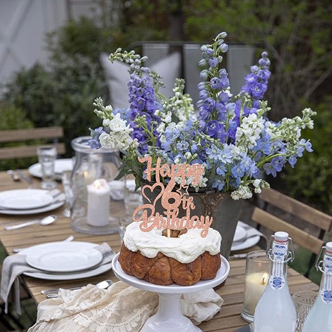 1 Pack Happy 6th Birthday Cake Topper - Glitter Heart Star 6 Fabulous Cake Picks - Rosegold