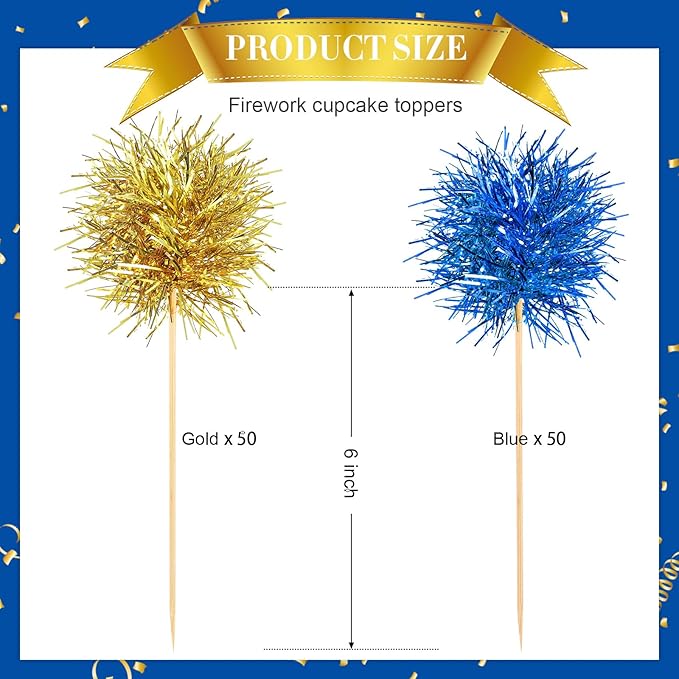 Chinco 100 Pcs Foil Firework Cupcake Toppers Sparkle Tinsel Cake Toppers Cake Decoration Cocktail Fruit Toothpick for Birthday Wedding Graduation Party(Blue, Gold)
