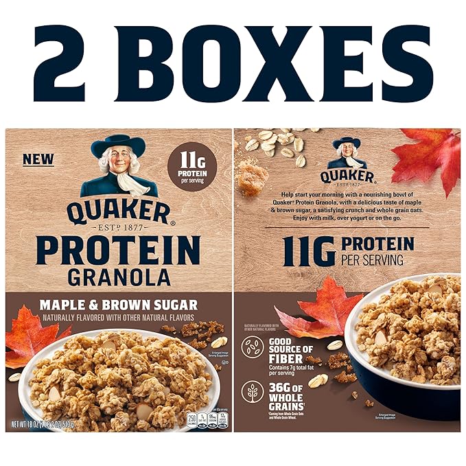 - Includes 2 (18oz) boxes of Quaker Protein Granola Breakfast Cereal, Maple Brown Suagr Flavor