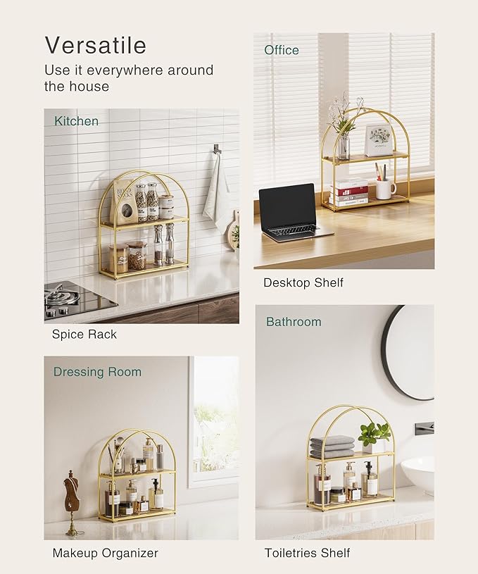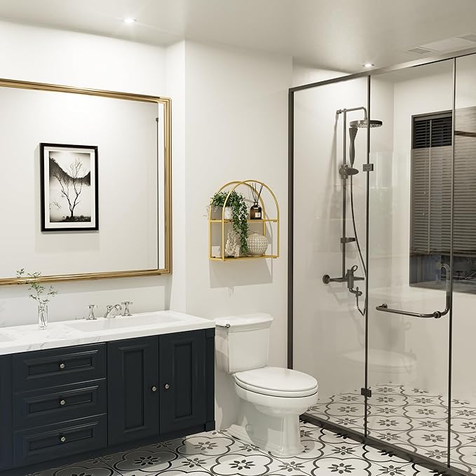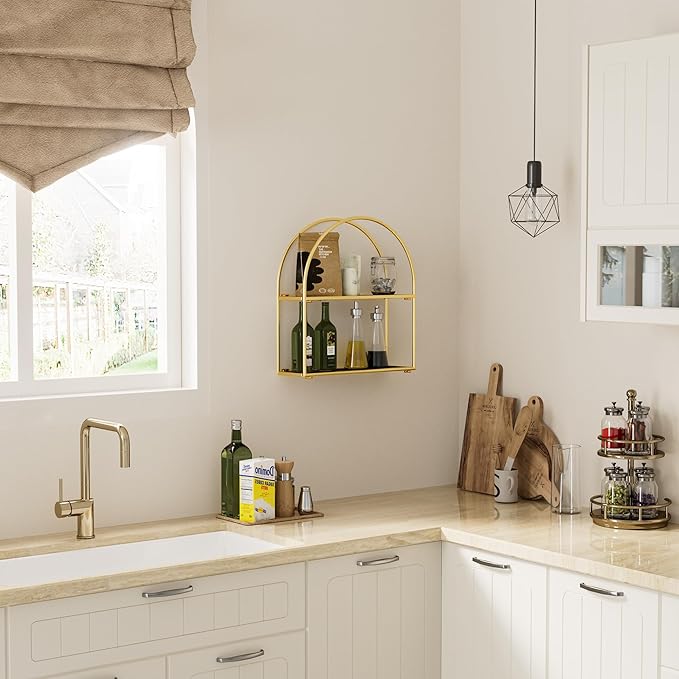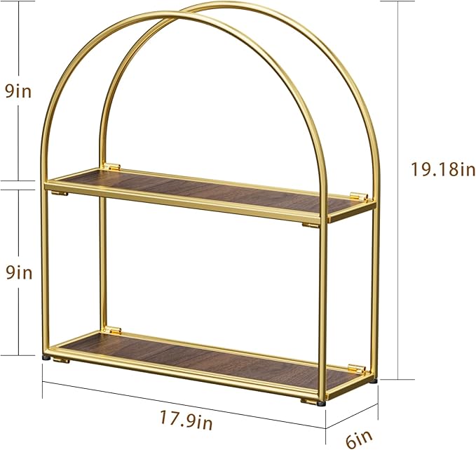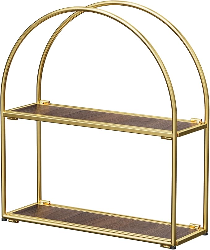 Crofy Gold Arched Frame Wall Shelf, Decorative 2 Tier Bathroom Wall Shelf with Walnut Finish Shelves and Robust Storage Capacity, 6" D x 17.9" W x 19.18" H