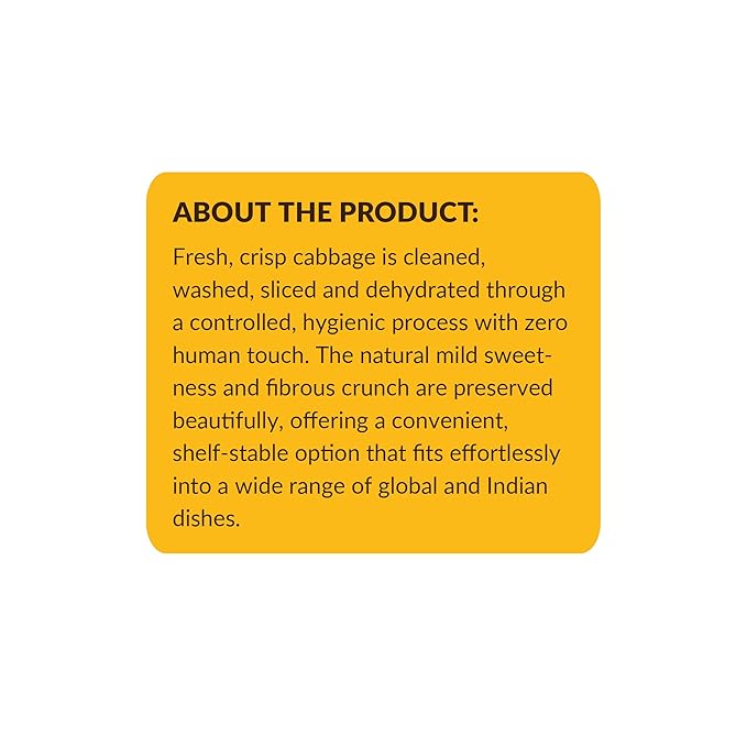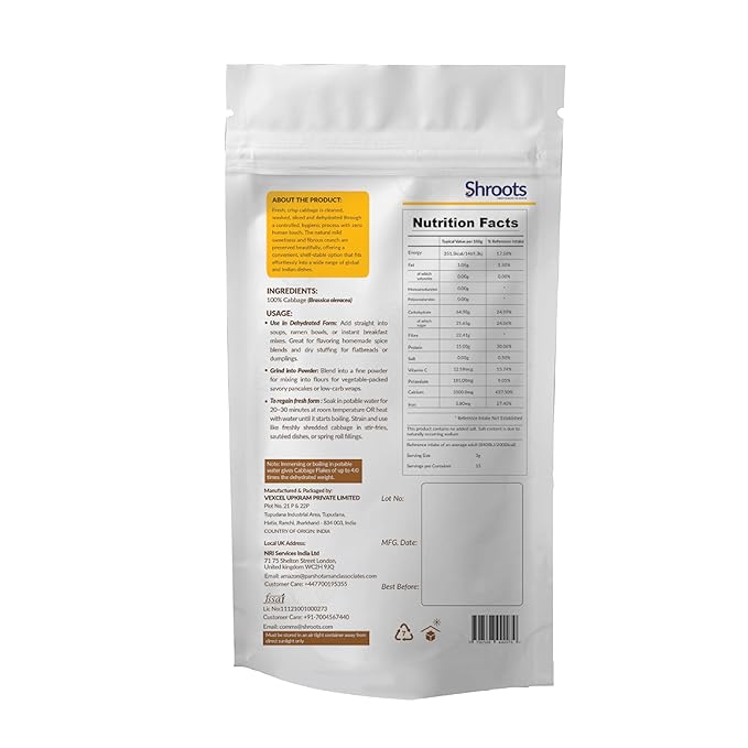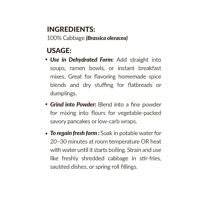 - How Many Serving?: Each 45g (1.59 oz) pack of SHROOTS Dehydrated Cabbage Flakes contains approximately 15 servings, with a standard 3g serving size, making it easy to add the right amount to your meals. These ready-to-use flakes are gluten-free, vegan, and contain no added salt or preservatives, offering a pure and healthy choice to enhance your dishes.