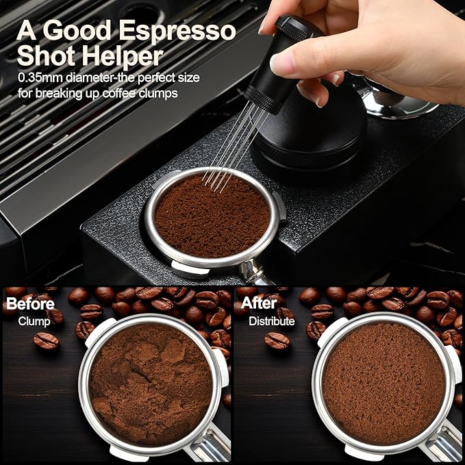 - 【A Perfect Espresso Shot Companion】 Nessus espresso distributor includes 10 food-grade stainless steel needles with a 0.35mm diameter, which is the perfect size to break up coffee clumps. For added convenience, we provide an extra set of 10 needles in a storage tube. A good choice to add this espresso machine accessories to your coffee bar!