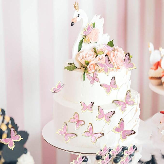 30pcs Pink Gold Edge Mixed Size Lively 3D Waterproof Swllowtail Butterfly Cupcake Topper for Girls Women's Happy Birthday Wedding Party Cake Wall Party Food Decorations