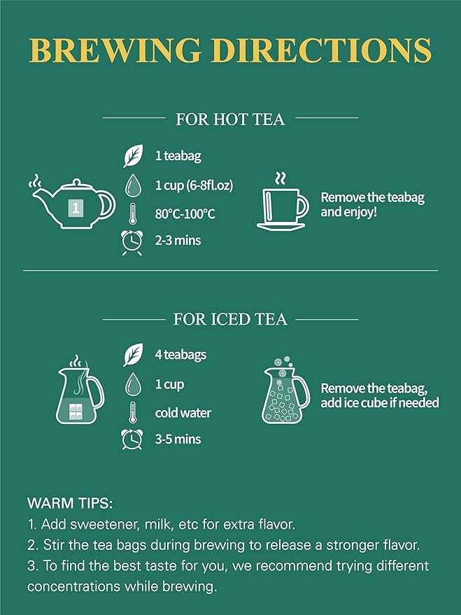 - [100 COUNT ECO-CONSCIOUS TEA BAGS] - Our premium tea bags are made from non-GMO plant fiber, and tea bags are unbleached and compostable. No string and no tag. No extra waste - just healthy & delicious tea!