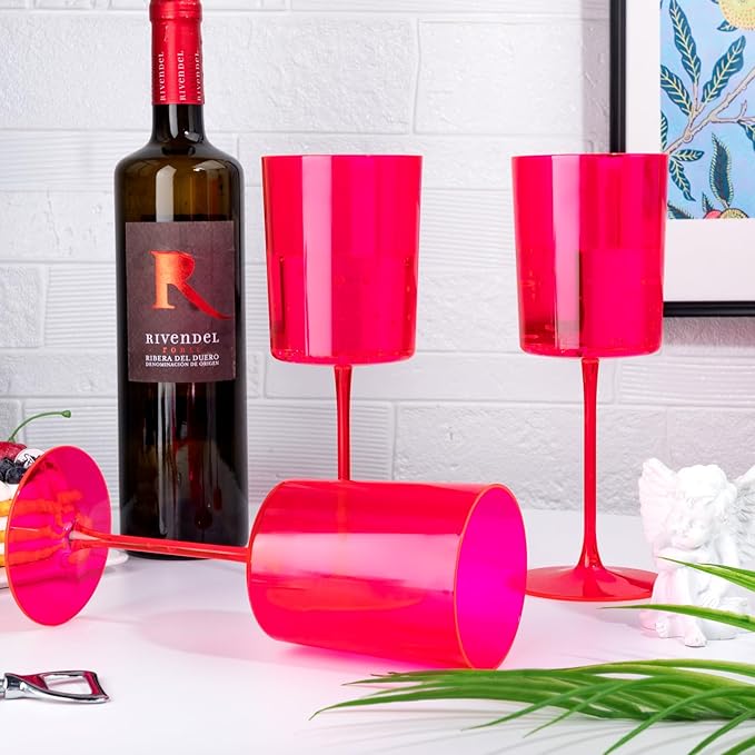 - The Perfect Gift: These hot Pink Plastic Wine Glasses are sophisticated, glamorous and luxurious. They will make a unique gift that your family and friends are guaranteed to impress! Celebrate life's most memorable moments with a disposable wine glasses for parties - weddings, anniversaries, mother's day, a costume reception or an engagement party that will surprise you beyond your wildest expectations.