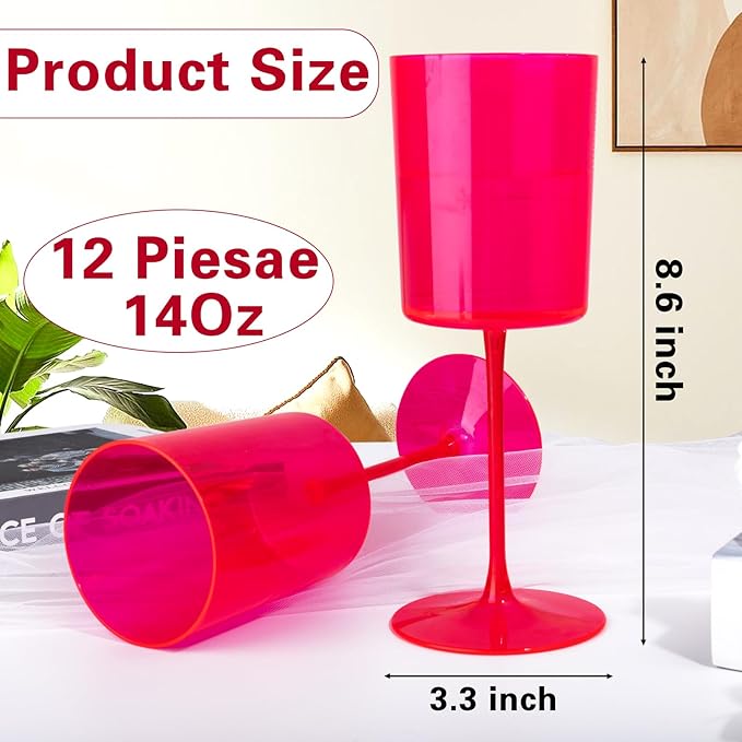 Ciaell 12 Pack Plastic Wine Glasses - 14Oz Hot Pink Plastic Wine Glasses With Stem - Disposable Stemmed Cups for Parties & Weddings