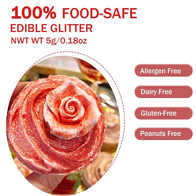 - Widely Used Edible Glossy Glitter for Desserts - Rose gold shimmer disco edible glitter dust is great to use for strawberries, chocolates decoration, cookies, fondant, elevates cakes, cupcakes, cake topper, and other gourmet baked goods, metal finish, fudge/chewing gum, pull candy/isomaltose, etc., It is also suitable for parties drinks decorating, like champagne, beverages, cocktails, and more