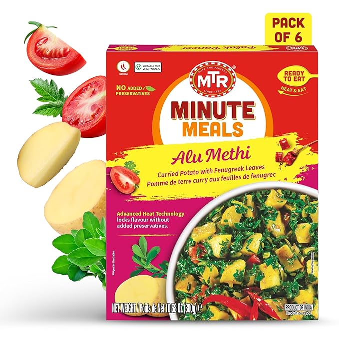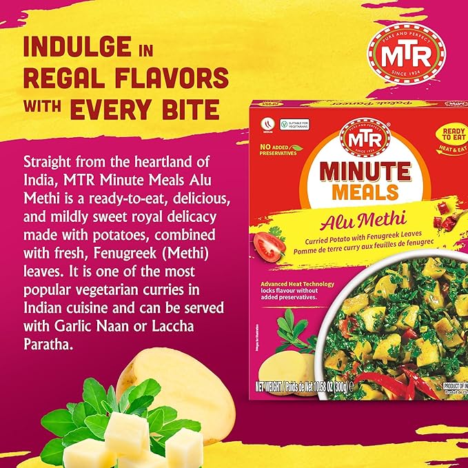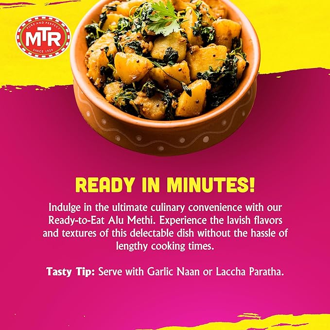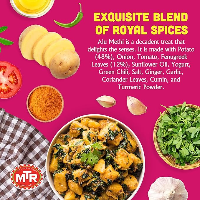 - BRINGING INDIAN FLAVORS HOME: Experience the authentic taste of India with MTR's Alu Methi, featuring curried potatoes harmoniously blended with fenugreek leaves in a delectable plant-based dish. Relish the comforts of Indian cuisine right at your own table.