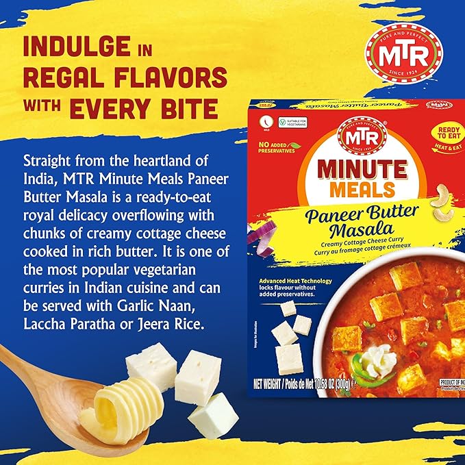 - AUTHENTIC INDIAN TASTE: Immerse yourself in the contemporary authenticity of MTR, blending traditional Indian recipes with modern culinary approaches. Experience the rich, aromatic journey of traditional Indian taste with MTR Paneer Butter Masala, featuring creamy cottage cheese curry—a culinary adventure to India from the comfort of your home.