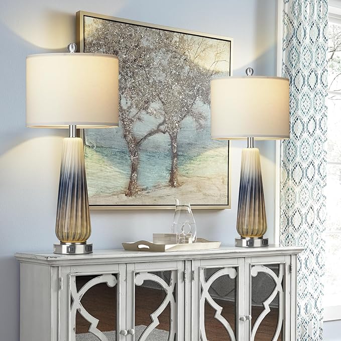 28" Glass Table Lamp Set of 2, Modern Table Lamps with USB A+C Ports & AC Outlet, Touch Control Bedside Nightstand Lamp with LED Night Light & White Fabric Shade for Living Room Blue(4 Bulbs Included)