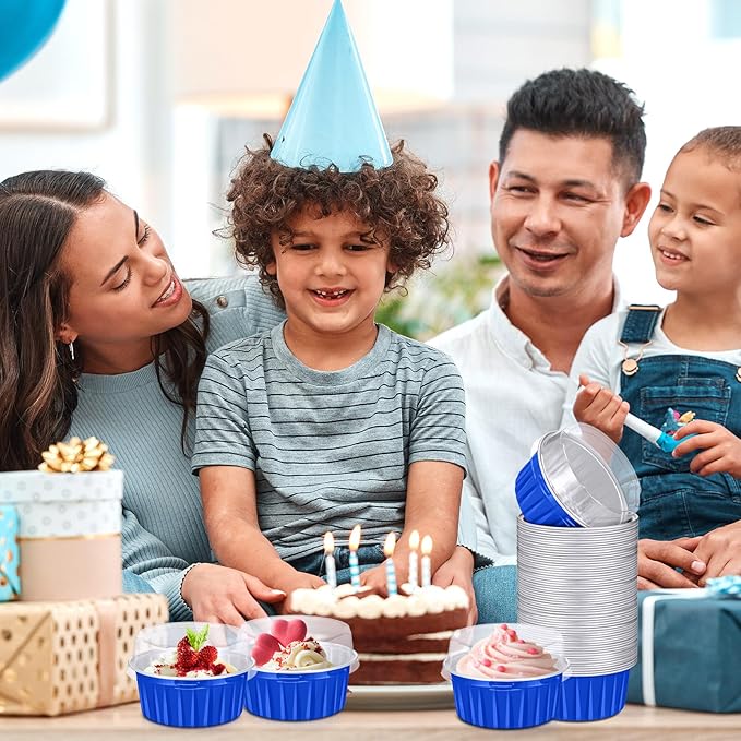Gejoy 400 Pcs Aluminum Foil Baking Cups with Lids 5 oz Disposable Ramekins Mini Cake Pans Creme Brulee Cupcake Liners Muffin Tins Flan Mold Dessert Container for Wedding(Dark Blue,Classic)