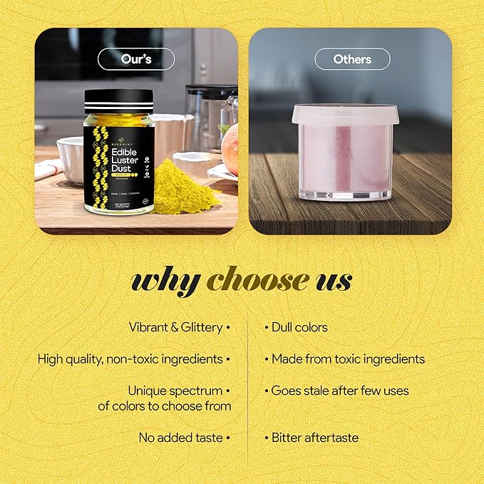 - Elevate Your Look with Precision: Experience the allure of our enhanced formula edible luster dust powder. With its refined texture, a mere dab achieves your desired effect. Each bottle contains 15g of transformative brilliance