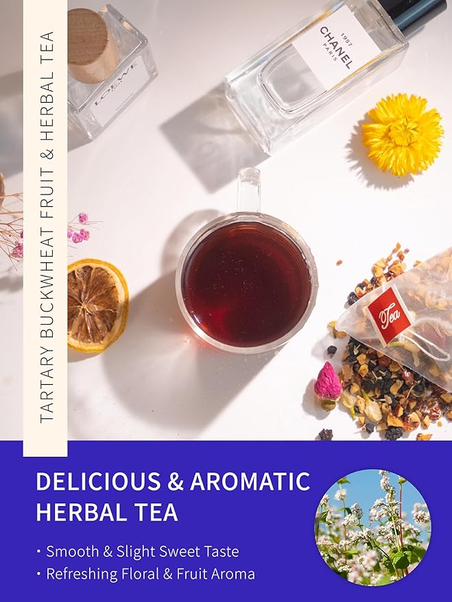 - [GREAT TASTE & FLAVOR] - Carefully blended Tartary buckwheat, rose, mulberries, red dates, and jasmine flowers provide you with a delicious tea that has a rich Tartary buckwheat aroma, mixed with a pleasant floral and fruity aroma, smooth taste with a slightly sweet taste.
