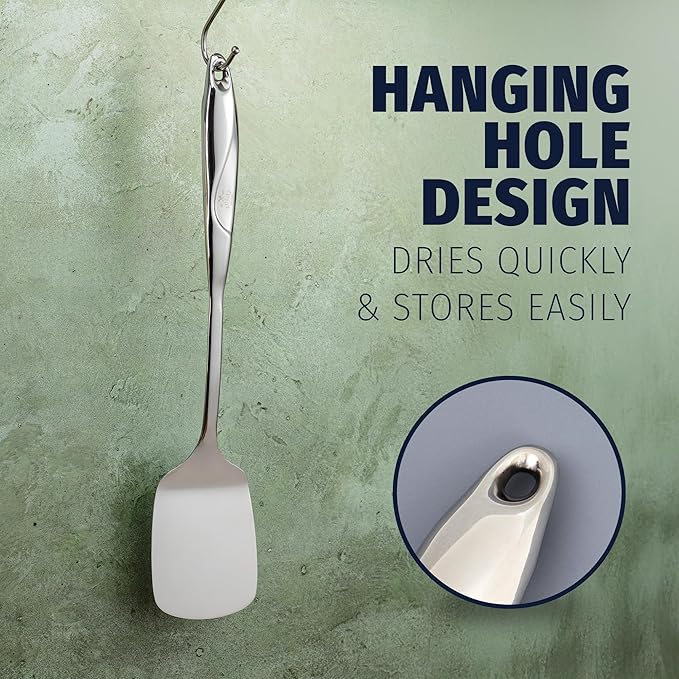 - EASY TO CLEAN, EASY TO STORE: Lightweight and easy to clean. This beautiful mirror-finished stainless steel slotted turner can be washed by hand or in the dishwasher. Includes a built-in hanging hole on the handle for easy storage after use. Perfect for flipping, stirring, stir-frying, draining, and more.