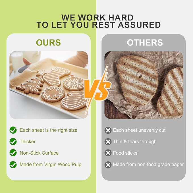 - 【Cut-free and smart packaging】 Forget annoying non-stick baking paper sheets that need to be sliced. Our pre-cut parchment paper is pre-cut to the appropriate size and kept in specially designed packaging that is easy to store without folding or tearing. You can simply take out a piece of parchment paper and line it on a baking sheet—no cutting, no curling—making your baking process easier.