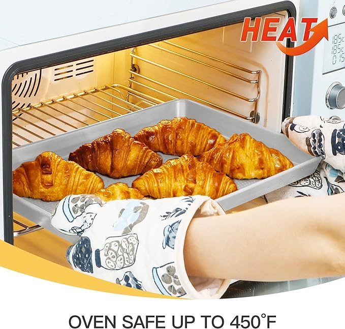 - PREMIUM EXTRA-THICK MATERIAL - With 57% thicker carbon steel, these durable oven trays are constructed from heavy-gauge carbon steel for stability, even heat distribution, and durability for years to come. Warranty against peeling off with heat-resistance temperature: 450℉.