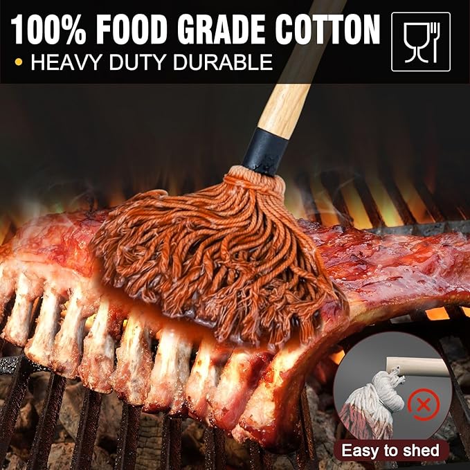 - 18INCH EXTRA LONG WOOD HANDLE: BBQ Basting Mop have extra long wood handle to keep your fingers from getting burnt while grilling, smoking steak, barbecue. The bbq mop solid wood handles are stronger and more durable, safe and environmentally friendly.