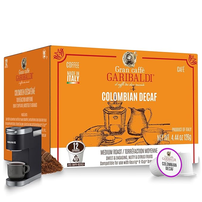 Caffè Garibaldi Colombian Decaf Coffee Pods, Single-Serve Capsules for Keurig K-Cup Brewers, Single Serve Cups with 100% Arabica Blend for Coffee Makers, 12 Count Recyclable Pods - Medium Roast