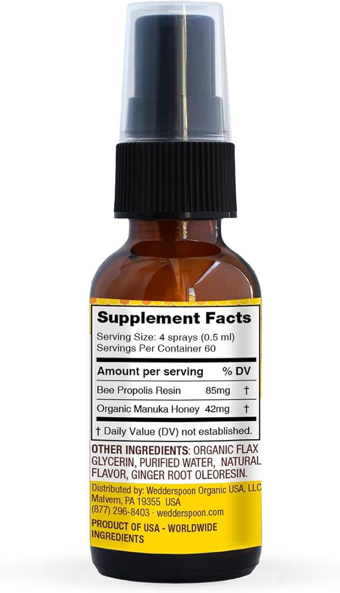 Wedderspoon Propolis and Manuka Honey Throat Spray, Lemon & Ginger, 1 Fl Oz (Pack of 1), Sore Throat Relief, Natural Immune Support