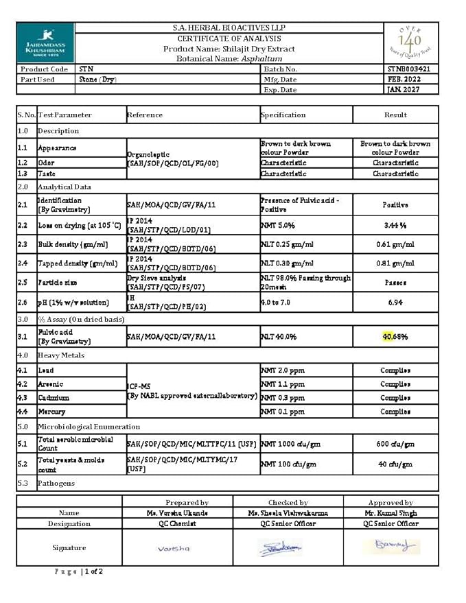 - LAB-TESTED FOR YOUR PEACE OF MIND: We are committed to providing only the highest quality shilajit to our customers. To ensure the utmost safety and efficacy of our product, our shilajit has been lab-tested for heavy metals, including lead, arsenic, cadmium, and mercury. This comprehensive testing process guarantees that our shilajit complies with the stringent United States standards for heavy metals, ensuring a product that is not only potent but also safe for consumption.