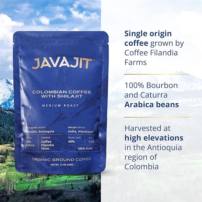 Colombian Coffee with Shilajit ??Medium Roast Organic Ground Coffee, Energy & Immunity Boost, 250mg Himalayan Shilajit per Serving, 16 Servings