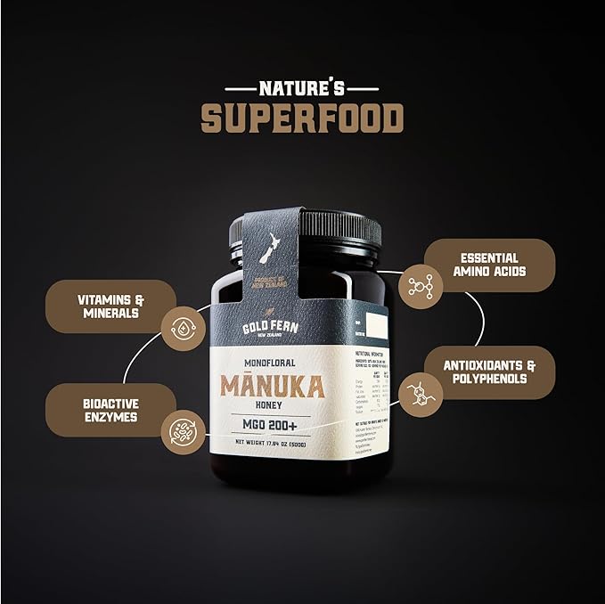 Gold Fern Honey - Raw New Zealand Manuka Honey | 1.1lb Monofloral MGO 200+ | Pure, Natural, Unpasteurized, and Unfiltered Superfood Honey, Traceable from Hive to Hand.