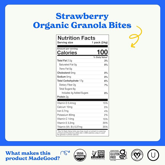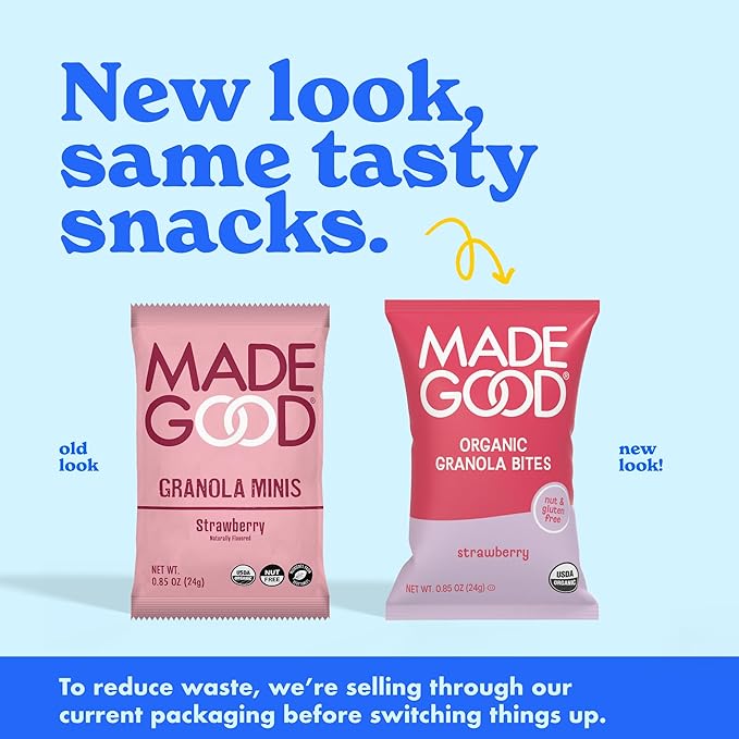 - Contains 28 (0.85 oz) MadeGood Granola Mini Strawberry pouches.