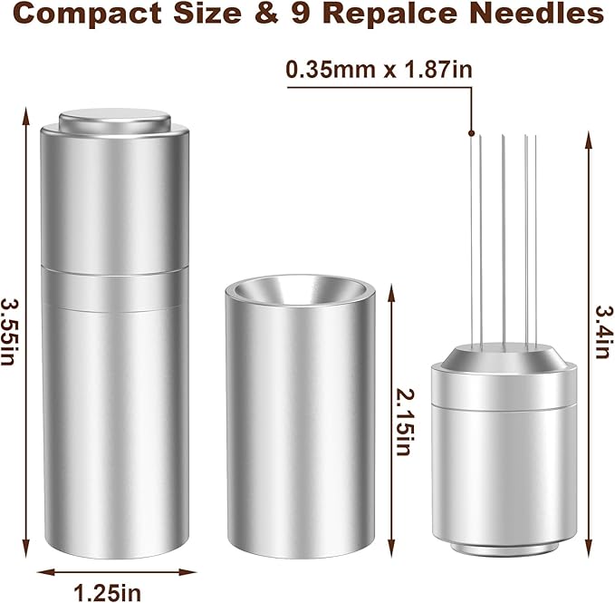 - Thinner 9+9 Food-grade 304 Stainless Steel Needles---This TIVERAIN WDT Espresso Stirrer Tool includes 9 needles installed are made of food safe stainless steel and 0.35mm in diameter, the perfect size which help to distribute the coffee evenly in the filter when the barista is making the coffee to promote a more even extraction and make espresso.We will give you an additional 9 replacement needles, which are convenient for you to disassemble and replace.