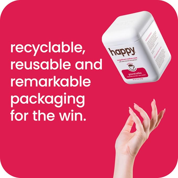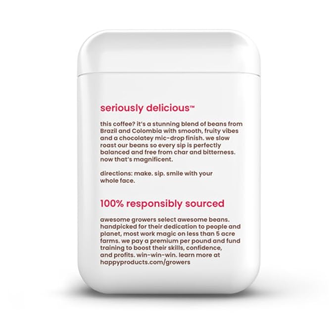 - seriously delicious: start your morning off right with happy’s magnificent medium roast ground coffee, thoughtfully sourced and expertly blended with notes of berries and optimism.