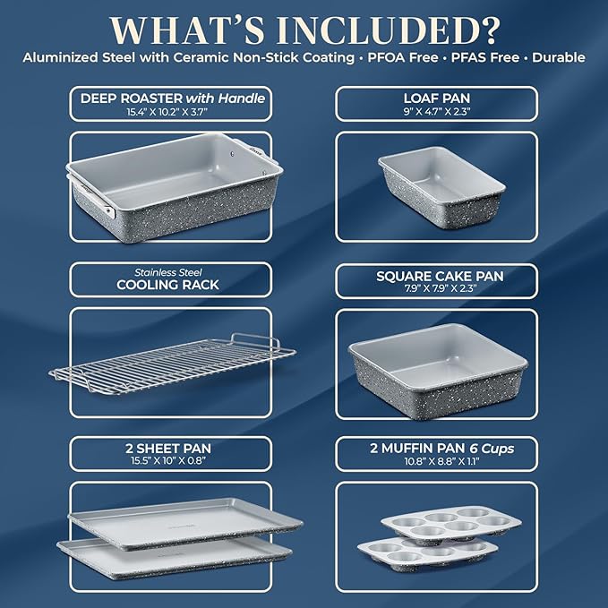 - COMPLETE SET FOR EVERY BAKING NEED: The set includes a stainless steel cooling rack, sheet pans, muffin pan, loaf pan, square cake pan, and a deep roaster with a handle, providing a comprehensive solution for your baking endeavors.