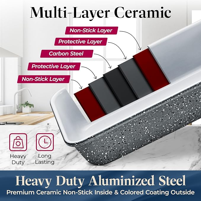 - DURABLE AND EVEN HEAT DISTRIBUTION: Crafted from high-gauge aluminized steel, this bakeware set offers durability and excellent heat distribution for consistent and delicious results every time.