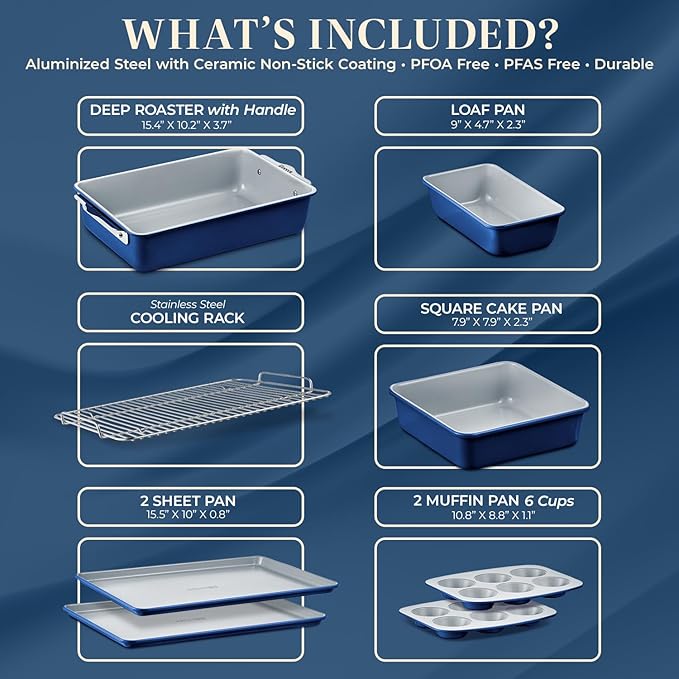 - COMPLETE SET FOR EVERY BAKING NEED: The set includes a stainless steel cooling rack, sheet pans, muffin pan, loaf pan, square cake pan, and a deep roaster with a handle, providing a comprehensive solution for your baking endeavors.