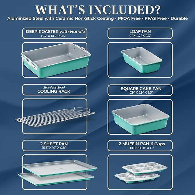 - COMPLETE SET FOR EVERY BAKING NEED: The set includes a stainless steel cooling rack, sheet pans, muffin pan, loaf pan, square cake pan, and a deep roaster with a handle, providing a comprehensive solution for your baking endeavors.
