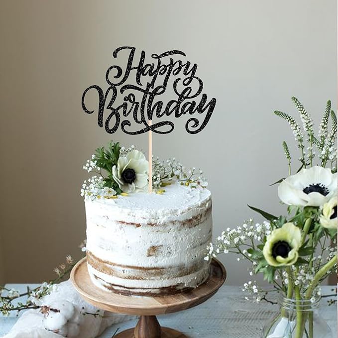 Rsstarxi 1 Pack Happy Birthday Cake Topper Glitter Men Women Birthday Cake Pick for Anniversary Celebration Party Decoration, Birthday Party Cake Decorations Supplies Black