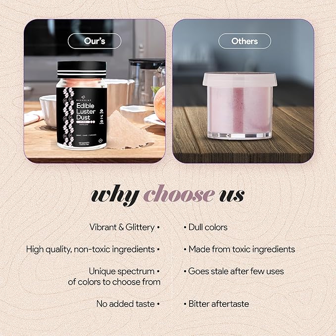 - Elevate Your Look with Precision: Experience the allure of our enhanced formula edible luster dust powder. With its refined texture, a mere dab achieves your desired effect. Each bottle contains 15g of transformative brilliance