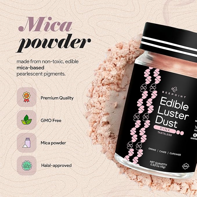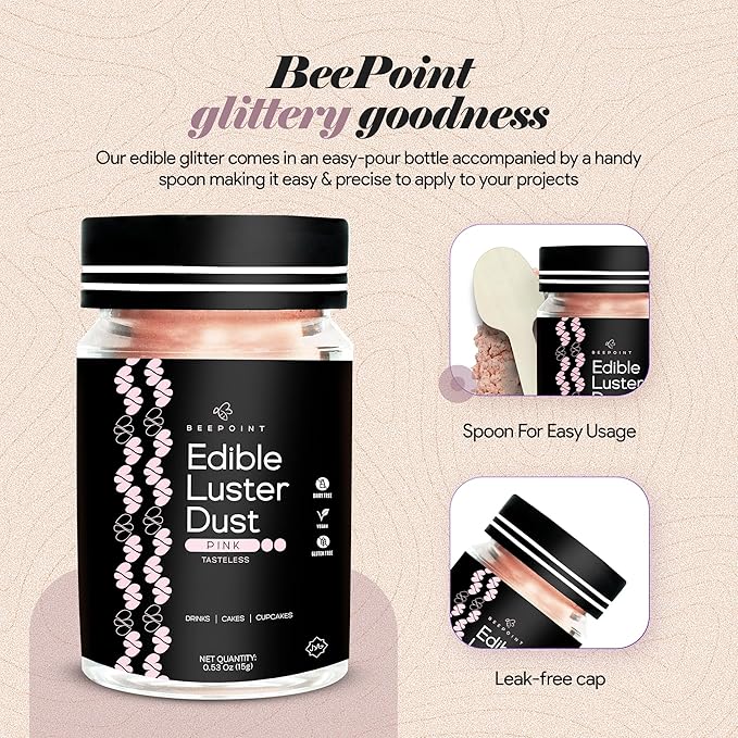 BeePoint Pink Edible Luster Dust 15g - Food Grade, Vibrant Color Shimmer Powdered Dust for Drinks, Cocktails, Cake Decorating, Baking, Chocolates, Candy, Sweets, & Cookies - Vegan & Gluten Free