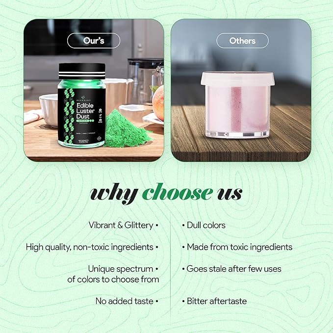 - Elevate Your Look with Precision: Experience the allure of our enhanced formula edible luster dust powder. With its refined texture, a mere dab achieves your desired effect. Each bottle contains 15g of transformative brilliance