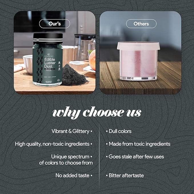 - Elevate Your Look with Precision: Experience the allure of our enhanced formula edible luster dust powder. With its refined texture, a mere dab achieves your desired effect. Each bottle contains 15g of transformative brilliance