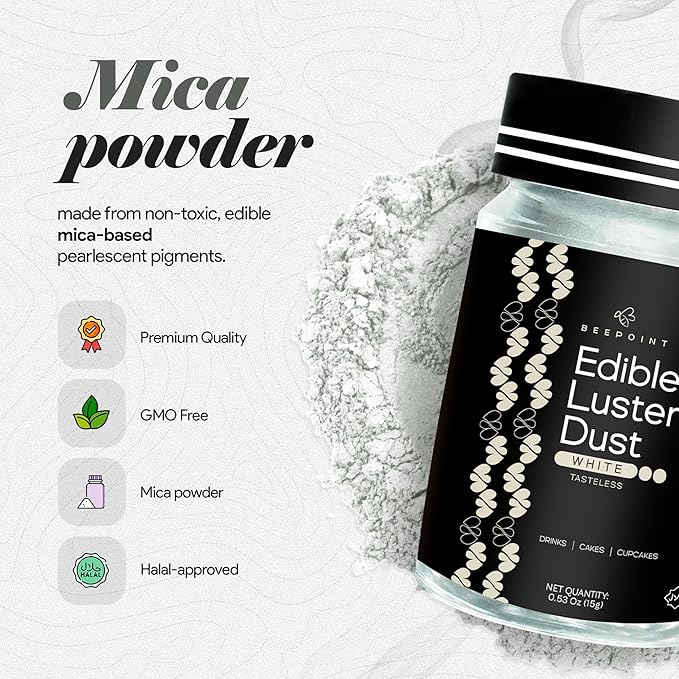 BeePoint White Edible Luster Dust 15g - Food Grade, Vibrant Color Shimmer Powdered Dust for Drinks, Cocktails, Cake Decorating, Baking, Chocolates, Candy, Sweets, & Cookies - Vegan & Gluten Free