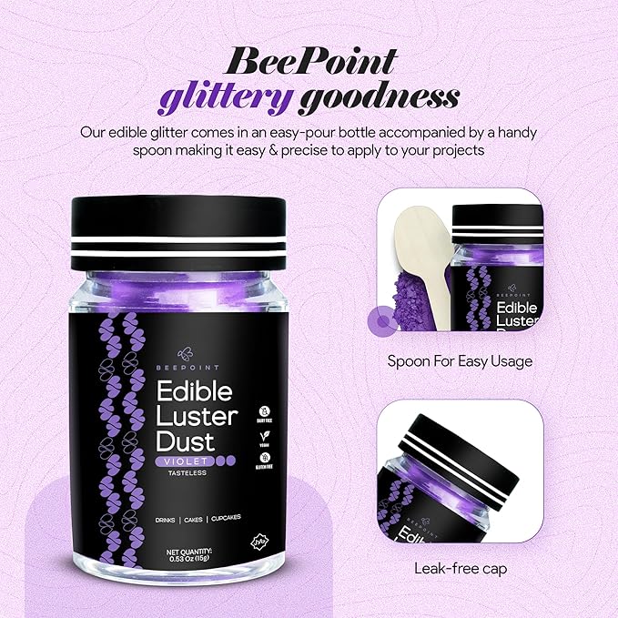 BeePoint Violet Edible Luster Dust 15g - Food Grade, Vibrant Color Shimmer Powdered Dust for Drinks, Cocktails, Cake Decorating, Baking, Chocolates, Candy, Sweets, & Cookies - Vegan & Gluten Free